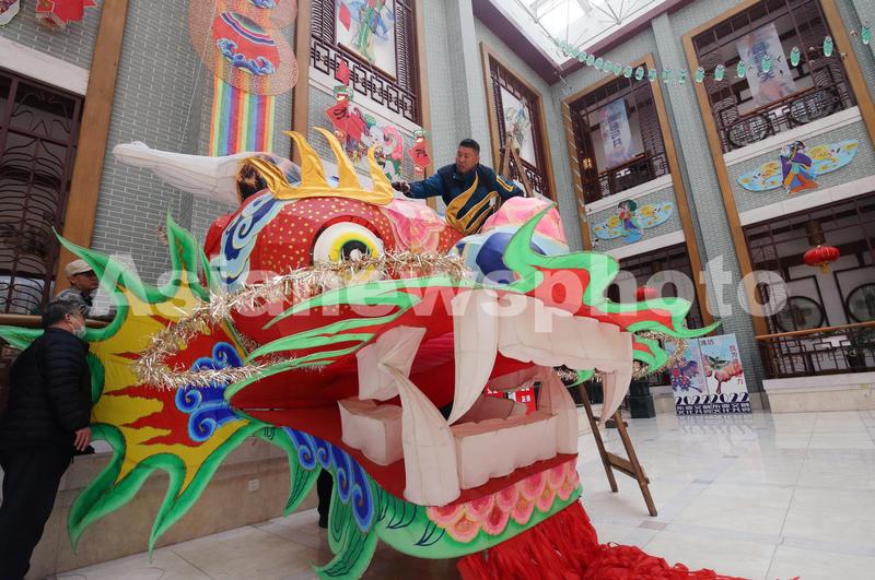 2023年3月28日,在山东潍坊世界风筝博物馆,工作人员正在悬挂巨型龙头风筝。