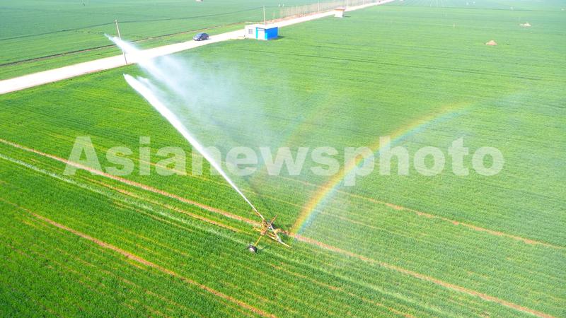 图片说明:3月30日,在山东省聊城市茌平区贾寨镇耿二庄村,种粮大户正用卷盘式灌溉机对小麦进行喷洒作业。(无人机照片)