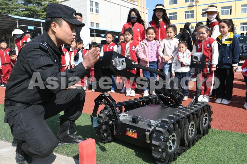 图片说明:2023年3月30日,在安徽省亳州市公安局特警支队,小朋友们正在参观体验警用设备。