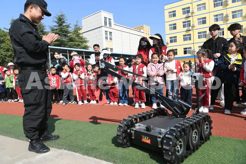 图片说明:2023年3月30日,在安徽省亳州市公安局特警支队,小朋友们正在参观体验警用设备。