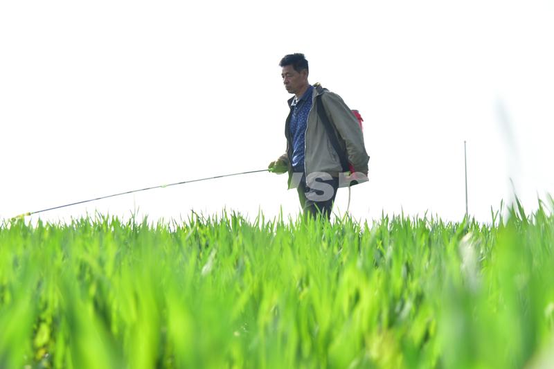 图片说明:3月30日,在山东省聊城市茌平区贾寨镇邢胡刘村,村民在给小麦喷施药物