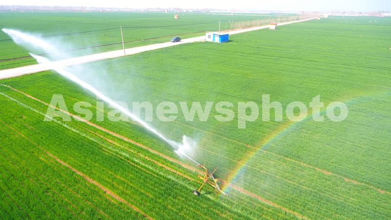 图片说明:3月30日,在山东省聊城市茌平区贾寨镇耿二庄村,种粮大户正用卷盘式灌溉机对小麦进行喷洒作业。(无人机照片)