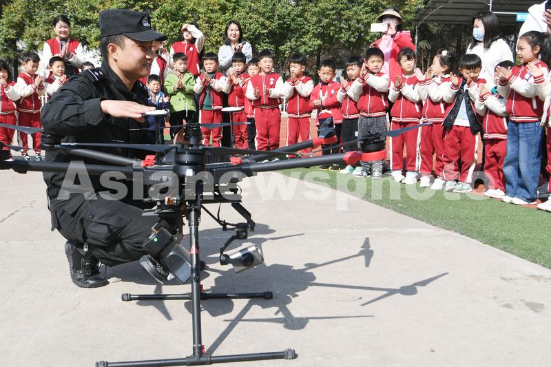 图片说明:2023年3月30日,在安徽省亳州市公安局特警支队,小朋友们正在参观体验警用设备。