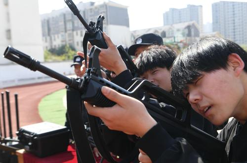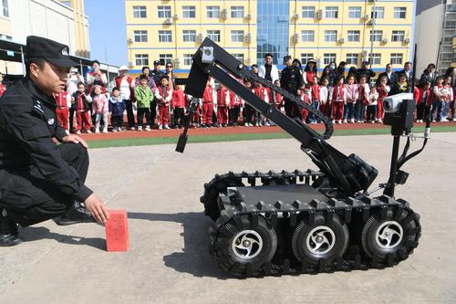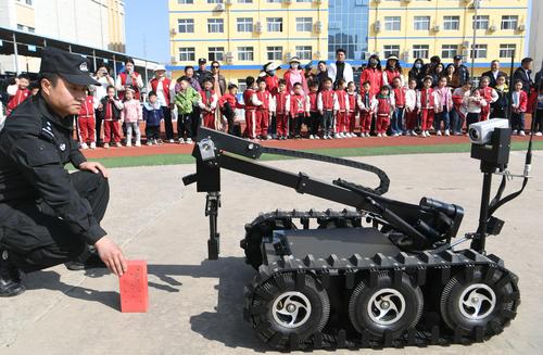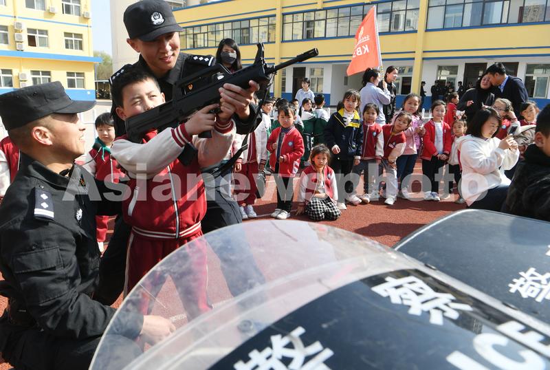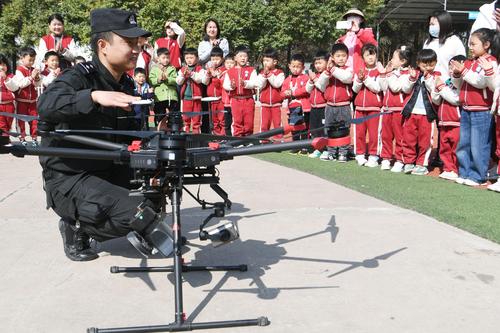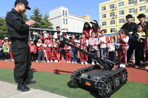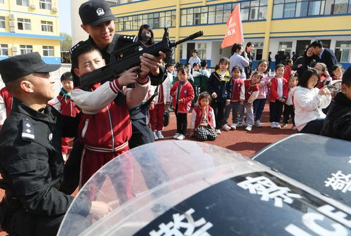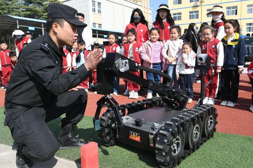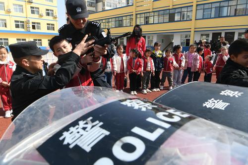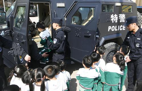 图片说明:2023年3月30日,在安徽省亳州市公安局特警支队,小朋友们正在参观体验警用设备。