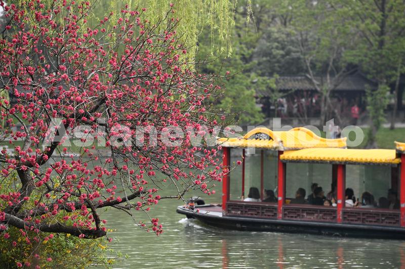 图片说明:2023年4月1日,游客在扬州瘦西湖景区赏景游玩。
