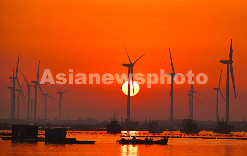 2023年4月2日,春日里的山东荣成桑沟湾海洋牧场,养殖网箱与风车交相互映,渔民迎着朝阳驾船出海,海上生产到处一派生机盎然的繁忙景象。