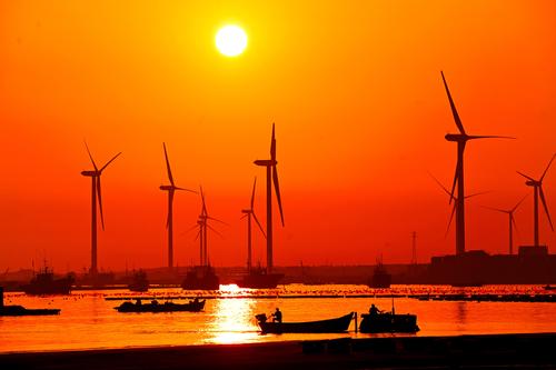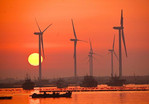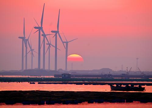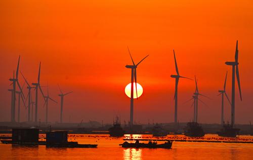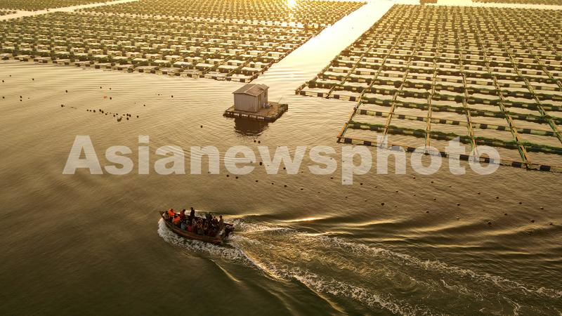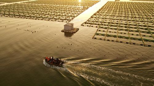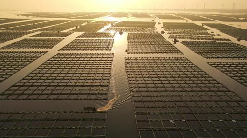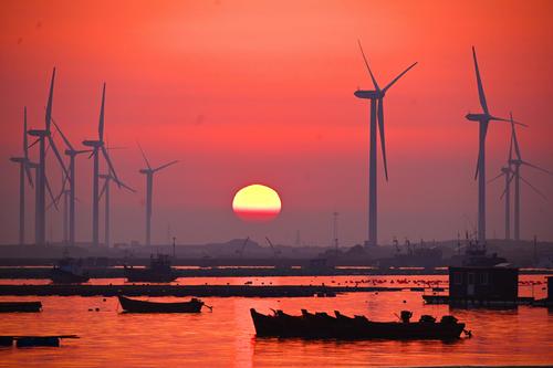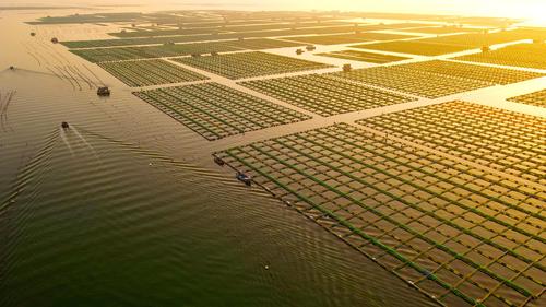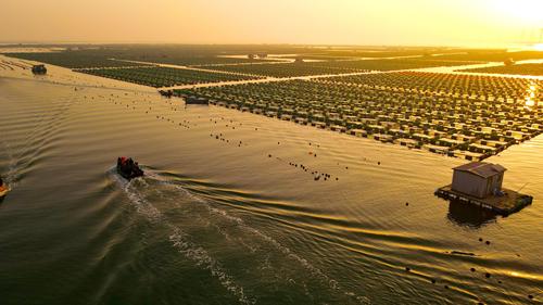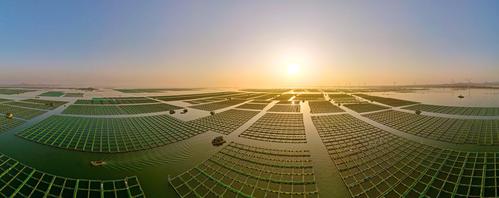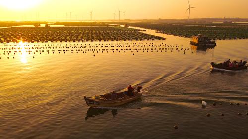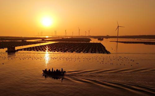 2023年4月2日,春日里的山东荣成桑沟湾海洋牧场,养殖网箱与风车交相互映,渔民迎着朝阳驾船出海,海上生产到处一派生机盎然的繁忙景象。