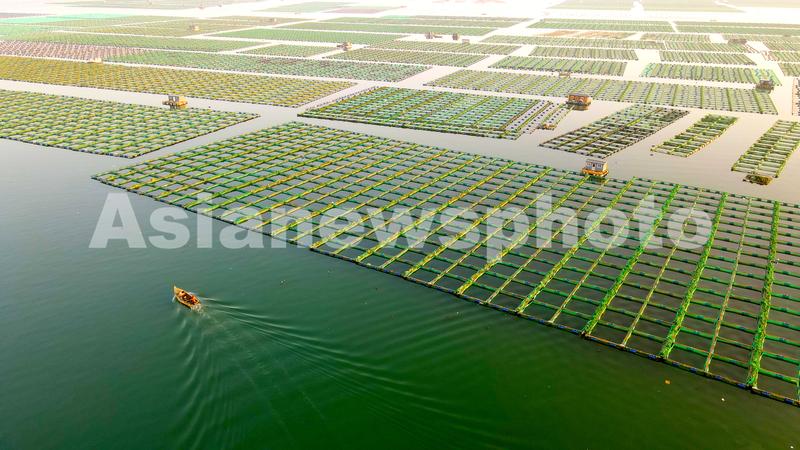 2023年4月2日,春日里的山东荣成桑沟湾海洋牧场,养殖网箱与风车交相互映,渔民迎着朝阳驾船出海,海上生产到处一派生机盎然的繁忙景象。