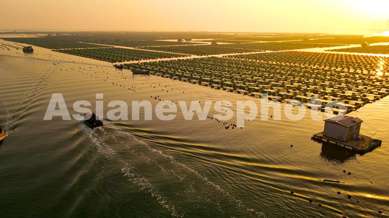 2023年4月2日,春日里的山东荣成桑沟湾海洋牧场,养殖网箱与风车交相互映,渔民迎着朝阳驾船出海,海上生产到处一派生机盎然的繁忙景象。