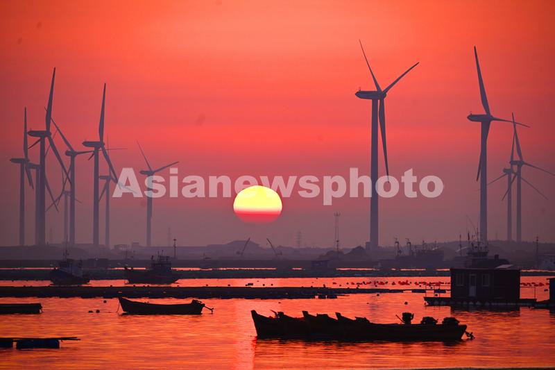 2023年4月2日,春日里的山东荣成桑沟湾海洋牧场,养殖网箱与风车交相互映,渔民迎着朝阳驾船出海,海上生产到处一派生机盎然的繁忙景象。