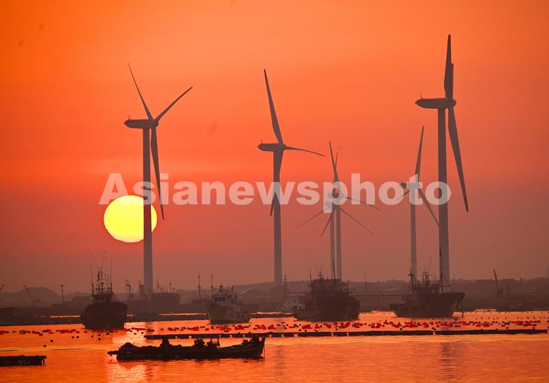 2023年4月2日,春日里的山东荣成桑沟湾海洋牧场,养殖网箱与风车交相互映,渔民迎着朝阳驾船出海,海上生产到处一派生机盎然的繁忙景象。