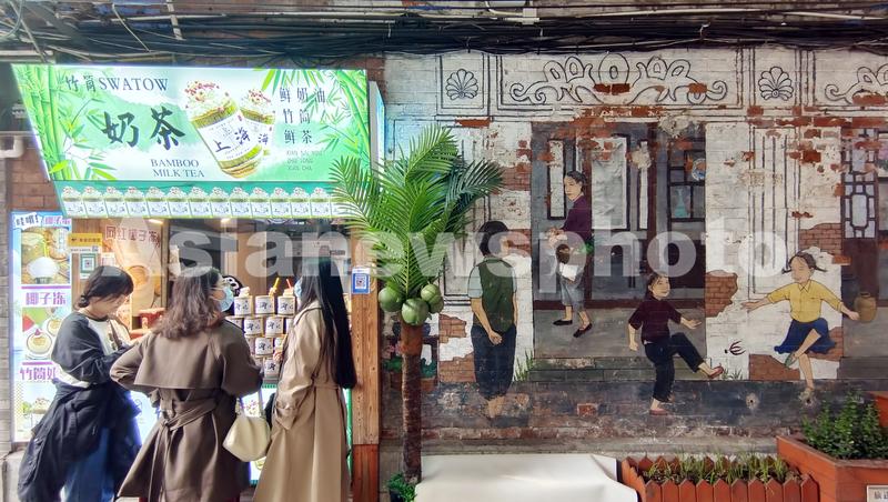 2023年4月5日,上海,海派文化旅游景点、网红石库门里弄田子坊吸引众多时尚青年游客打卡。图为奶茶店的墙绘展示20世纪的儿童游戏和怀旧生活场景。