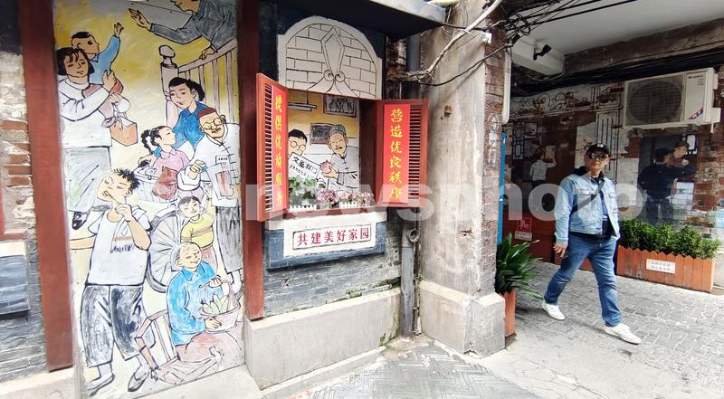2023年4月5日,上海,海派文化旅游景点、网红石库门里弄田子坊吸引众多时尚青年游客打卡。图为弄堂墙绘展示20世纪的儿童游戏和怀旧生活场景。