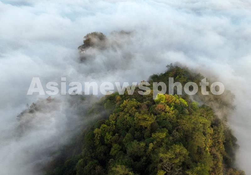 2023年4月7日,安徽省黄山市休宁县齐云山景区云海翻涌。(无人机照片) 当日早晨,春雨初歇的安徽齐云山风景区,云海涌动,唯美壮观,宛若仙境。