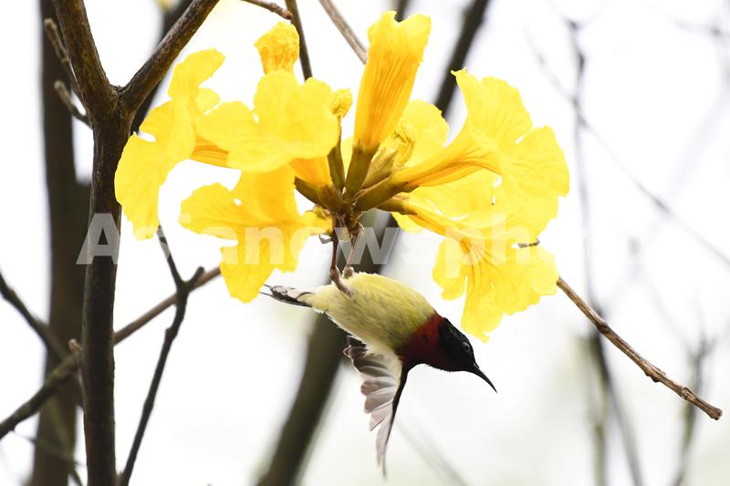 关键词:叉尾太阳鸟;黄花风铃木;亚洲蜂鸟