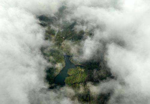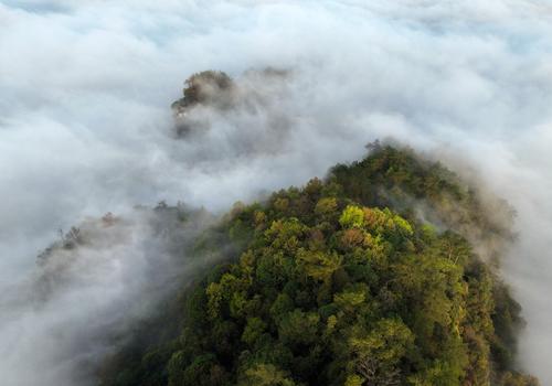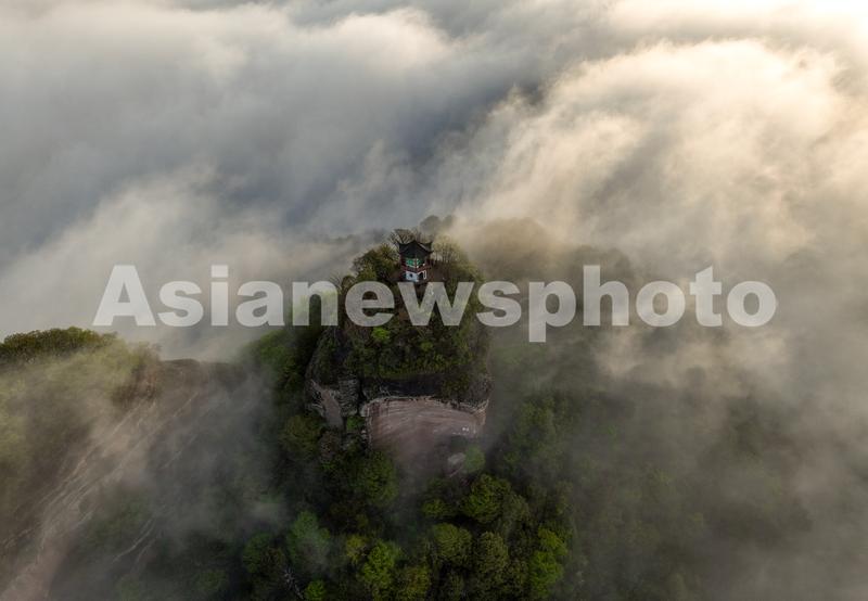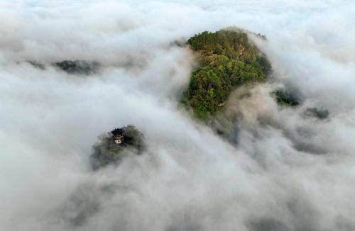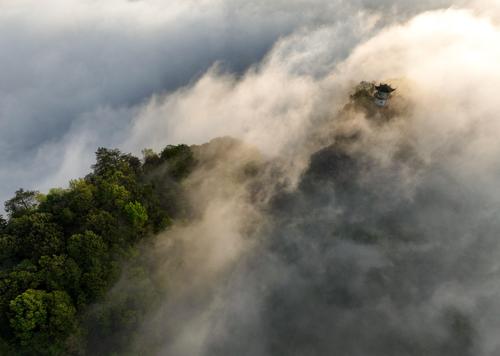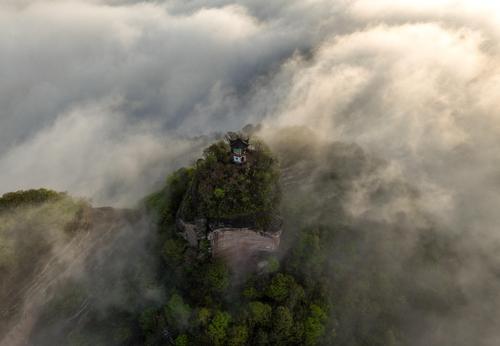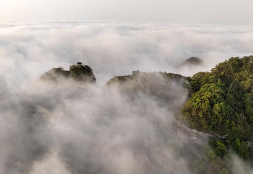 2023年4月7日,安徽省黄山市休宁县齐云山景区云海翻涌。(无人机照片) 当日早晨,春雨初歇的安徽齐云山风景区,云海涌动,唯美壮观,宛若仙境。