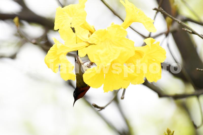 关键词:叉尾太阳鸟;黄花风铃木;亚洲蜂鸟