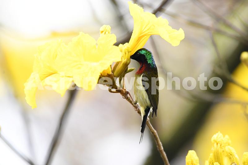 关键词:叉尾太阳鸟;黄花风铃木;亚洲蜂鸟
