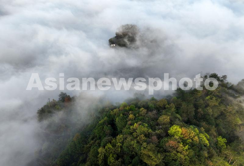 2023年4月7日,安徽省黄山市休宁县齐云山景区云海翻涌。(无人机照片) 当日早晨,春雨初歇的安徽齐云山风景区,云海涌动,唯美壮观,宛若仙境。