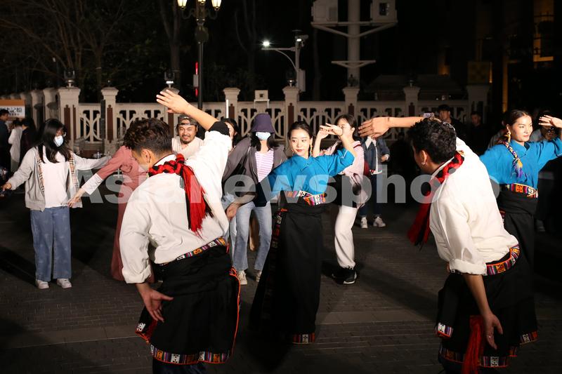 玛曲县藏族歌舞团的演员带领游客跳锅庄舞。