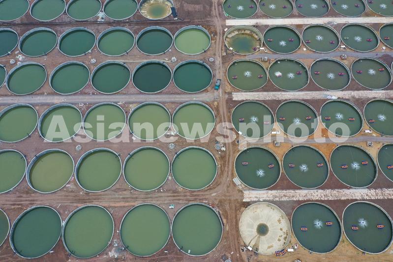2023年4月9日,养殖户在自治区重大项目广西梧州岑溪市归义镇荔枝村绿色智能生态渔业产业基地陆基圆池养鱼场投料喂鱼,观察鱼的生长状况。