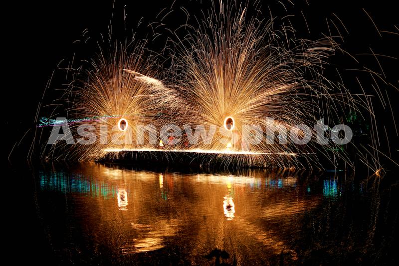 2023年4月8日,民间艺人在四川省泸州市纳溪区大渡口镇花田酒地景区现场表演“打铁花”。