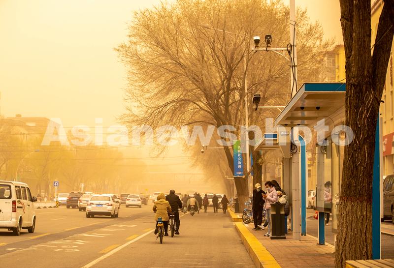 2023年4月10日,呼和浩特,市民在沙尘中出行。