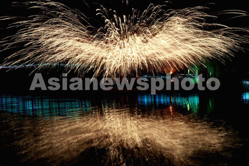 2023年4月8日,在四川省泸州市纳溪区大渡口镇花田酒地景区,民间艺人现场表演国家级非物质文化遗产项目“打铁花”,高温之下,铁水在半空中洒开,金花四溅、流光溢彩,犹如一簇簇绚丽的烟花绽放夜空,为现场游客带来一场视觉盛宴。