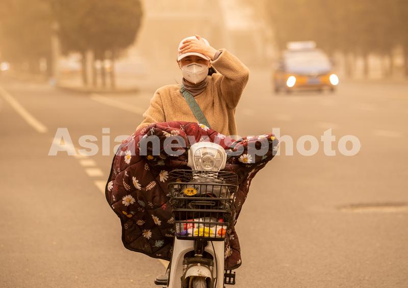2023年4月10日,呼和浩特,市民在沙尘中出行。