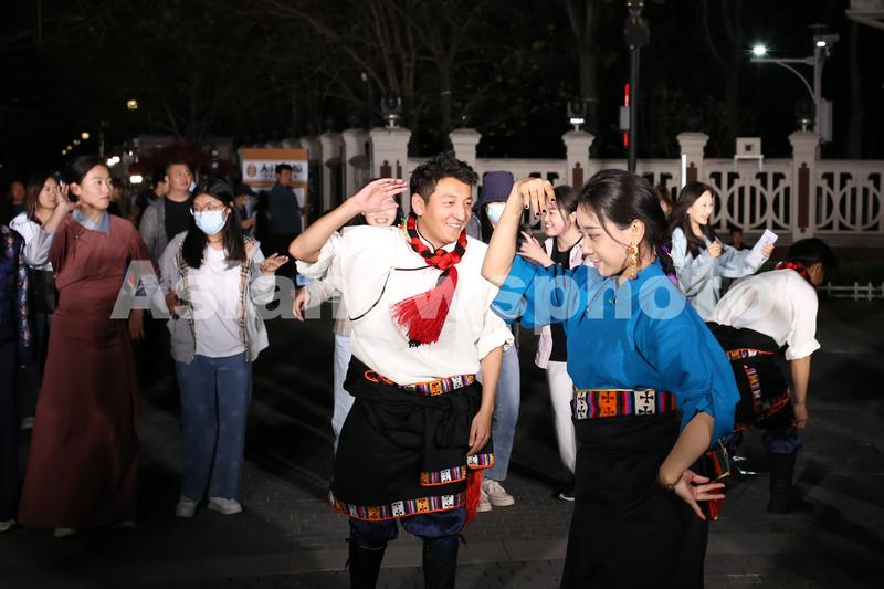 玛曲县藏族歌舞团的演员带领游客跳锅庄舞。