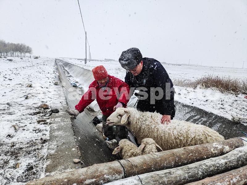图片说明:2023年4月8日,民警将羊从沟渠中救出