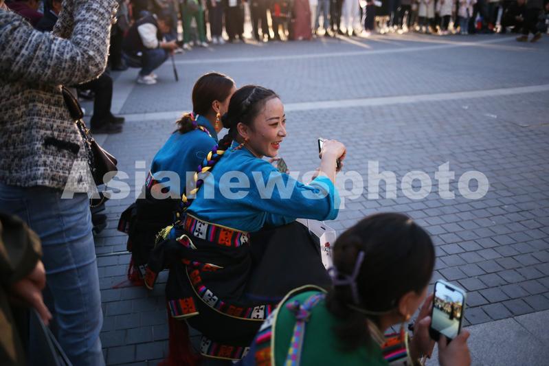 玛曲县藏族歌舞团的演员观看天津相声表演。