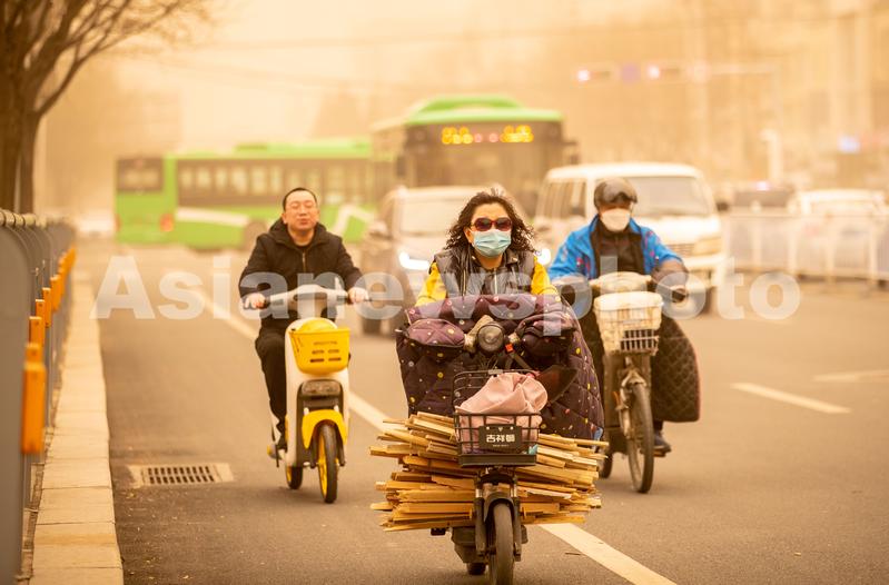 2023年4月10日,呼和浩特,市民在沙尘中出行。