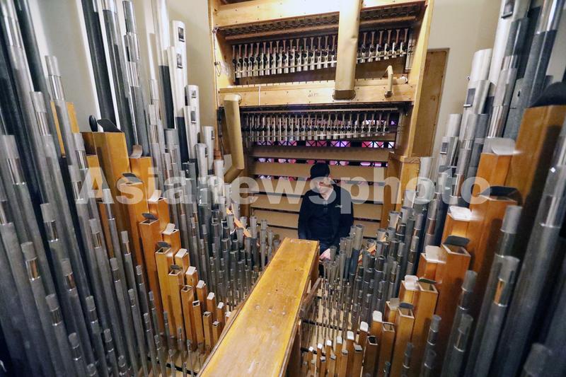 4月7日晚,在北京协和医学院壹号礼堂,专家在管风琴琴房忙碌工作。