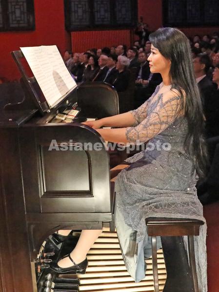 4月7日晚,中央音乐学院教授、协和医学院管风琴音乐艺术总监沈媛在北京协和医学院壹号礼堂演奏管风琴。