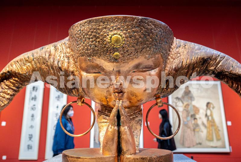 2023年4月11日,呼和浩特,观众在内蒙古美术馆参观雕塑作品《吉祥草原》。