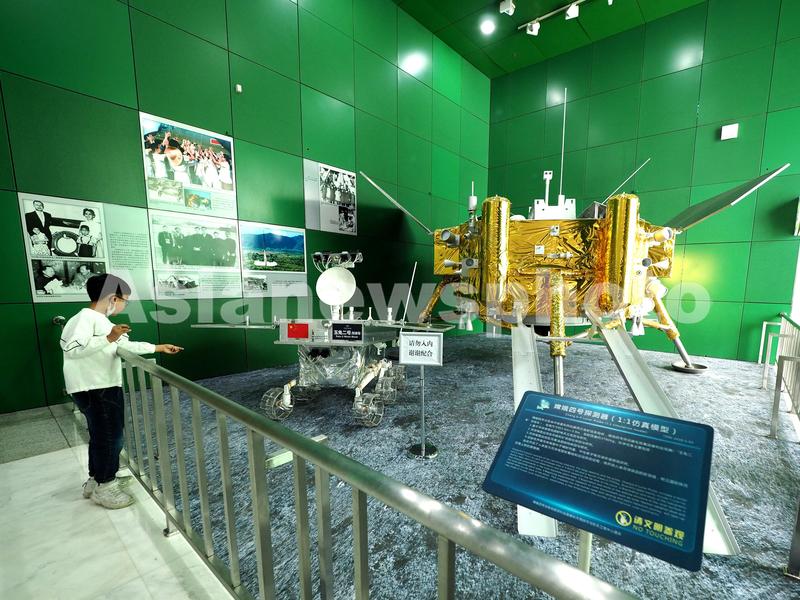 2023年4月12日,中国科技馆太空探索展区内,小朋友在参观“嫦娥四号探测器”模型。