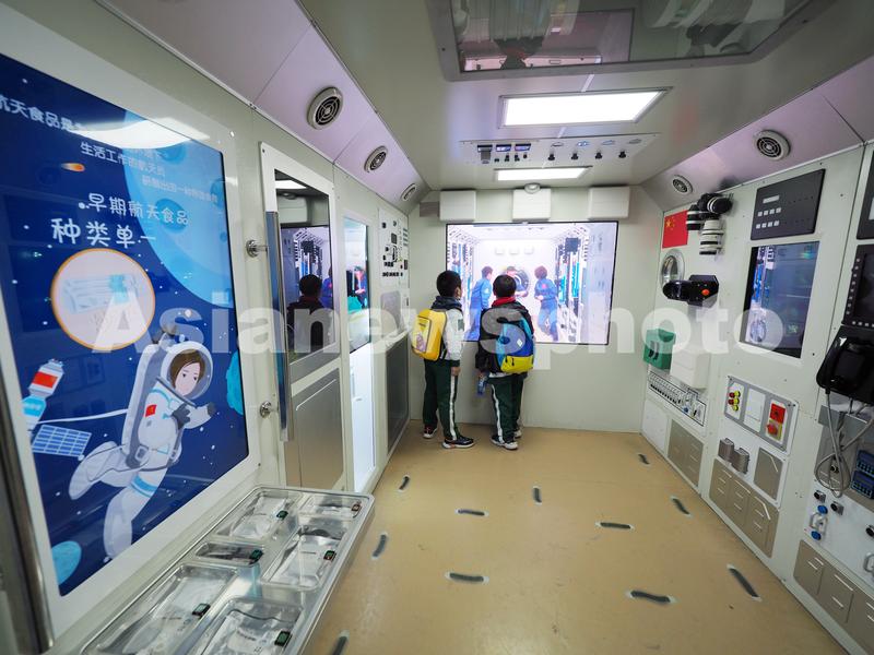 2023年4月12日,是世界航天日,小朋友在中国科技馆内参观体验、学习航天知识。