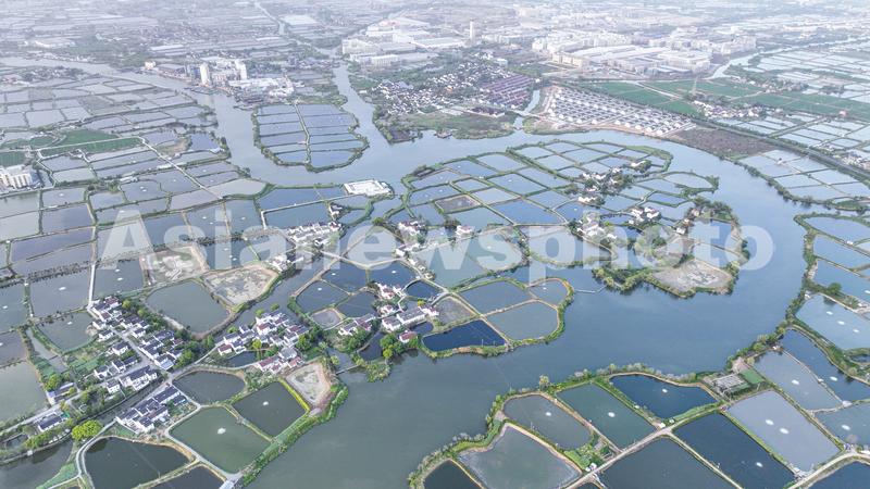 图片说明:2023年4月13日,航拍浙江省湖州市南浔区和孚镇,星罗棋布的千年桑基鱼塘系统与盛开的桑树相映成趣,景美如画。