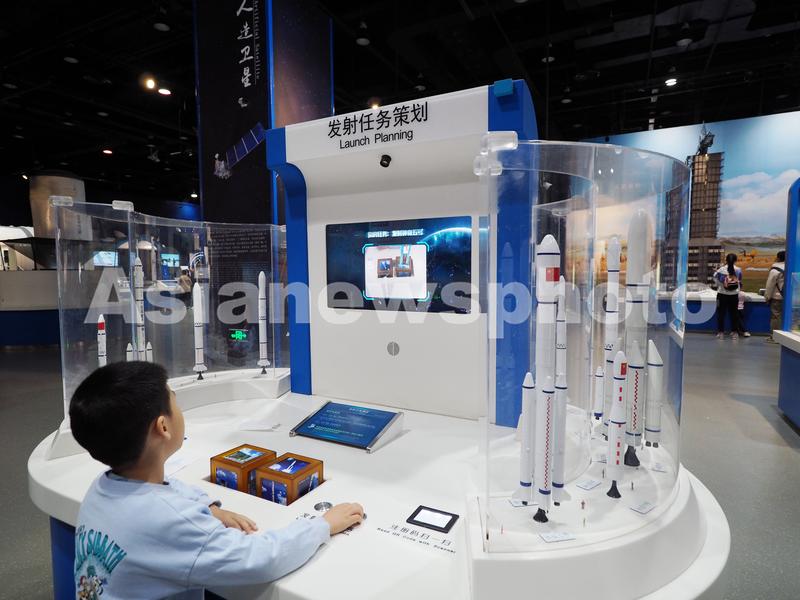2023年4月12日,中国科技馆太空探索展区内,小朋友在体验“发射任务策划”。
