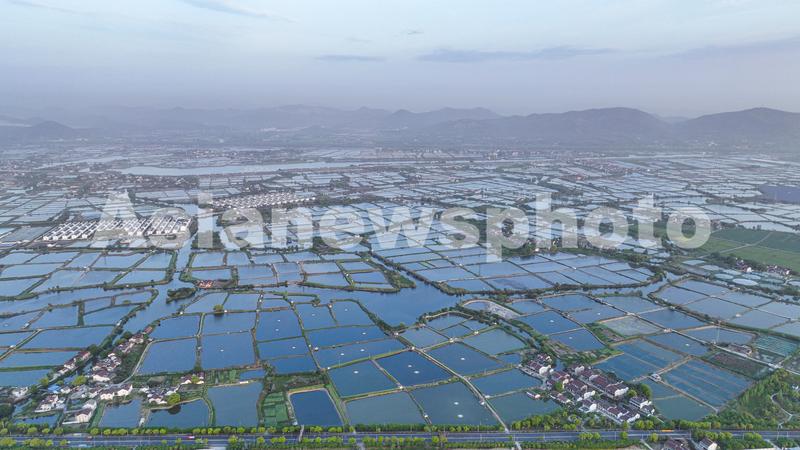 图片说明:2023年4月13日,航拍浙江省湖州市南浔区和孚镇,星罗棋布的千年桑基鱼塘系统与盛开的桑树相映成趣,景美如画。