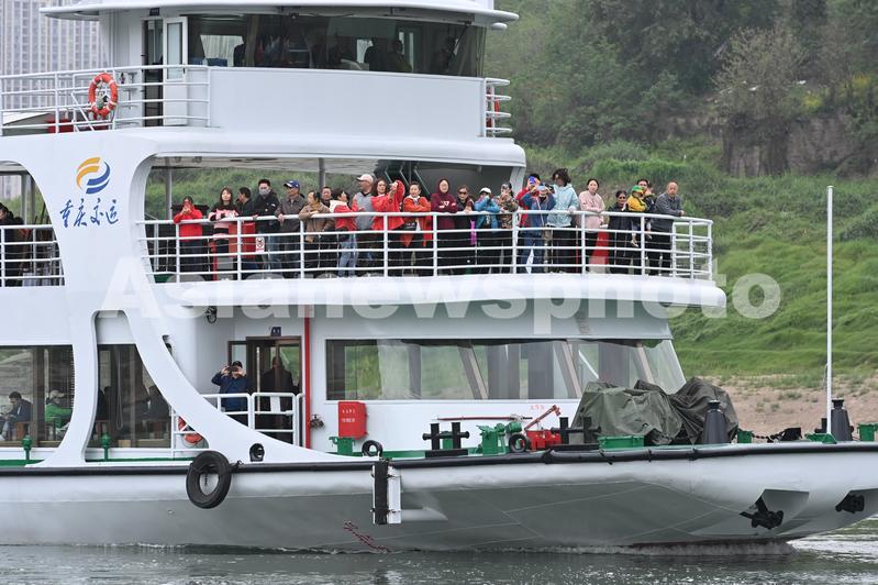 2023年4月6日,重庆市沙坪坝区,磁器口-洪崖洞的首班轮渡行驶在嘉陵江上,游客在欣赏两岸风光。