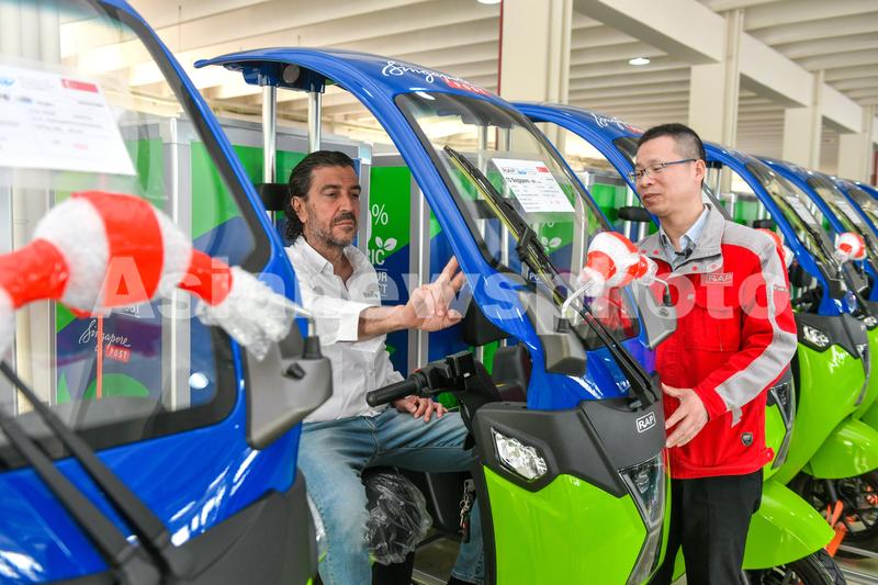 2023年4月14日,位于浙江省湖州市长兴经济技术开发区的浙江睿璞智能汽车股份有限公司数字化车间,西班牙客商正在实地察看高端新能源微型物流车产品。