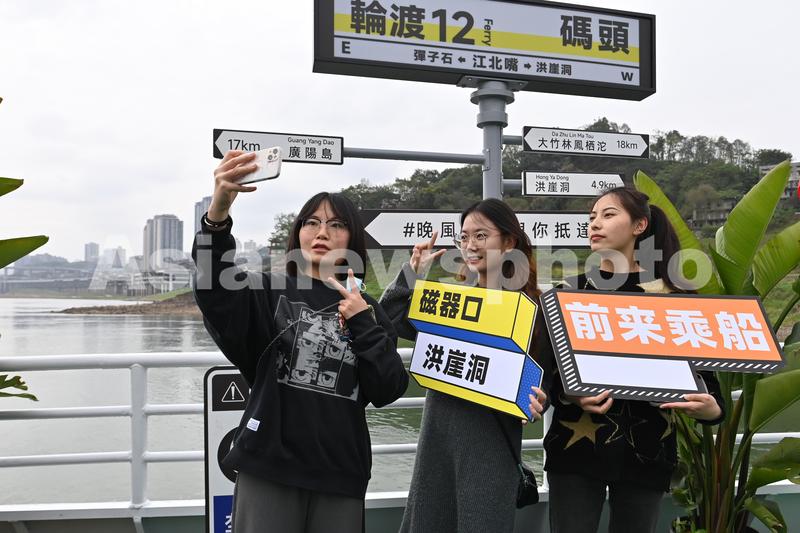 2023年4月6日,重庆市沙坪坝区,磁器口-洪崖洞的首班轮渡行驶在嘉陵江上,游客在合影留念。