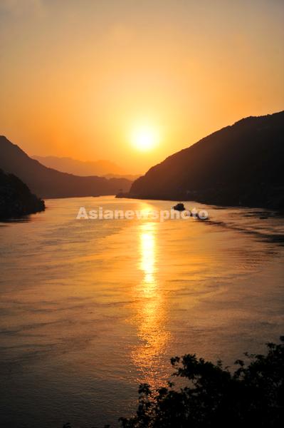2023年4月16日,在湖北省宜昌市夷陵区乐天溪镇拍摄的晚霞映耀中的长江西陵峡风景。当日,位于湖北省宜昌市夷陵区乐天溪段的长江西陵峡水域,金色霞光映洒满江面,生态峡江呈现如画风景。