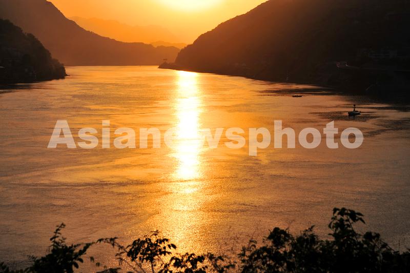 2023年4月16日,在湖北省宜昌市夷陵区乐天溪镇拍摄的晚霞映耀中的长江西陵峡风景。当日,位于湖北省宜昌市夷陵区乐天溪段的长江西陵峡水域,金色霞光映洒满江面,生态峡江呈现如画风景。