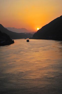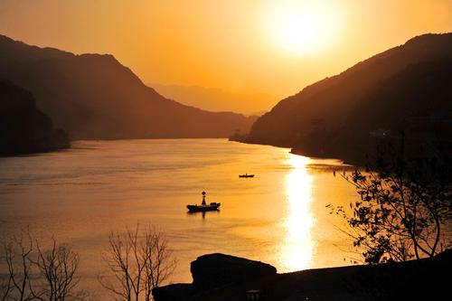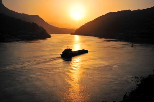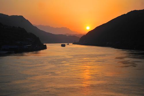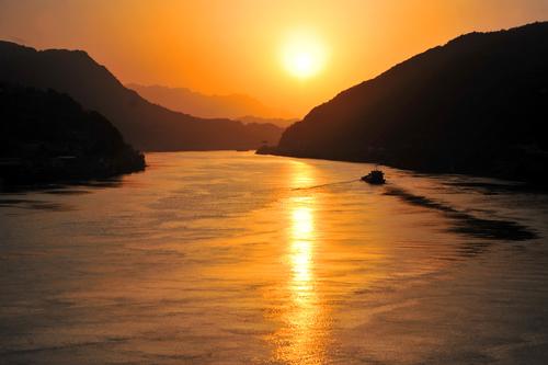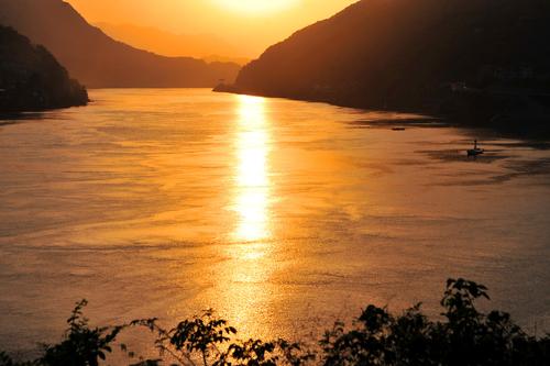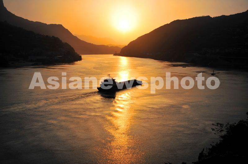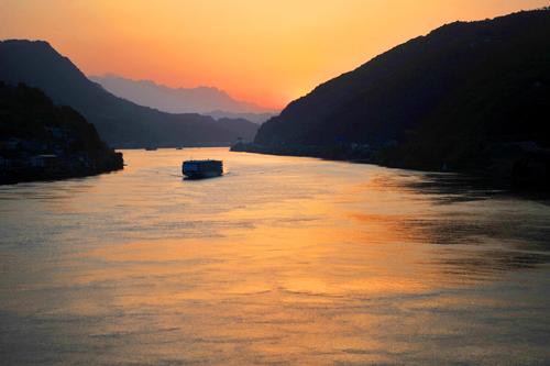 2023年4月16日,在湖北省宜昌市夷陵区乐天溪镇拍摄的晚霞映耀中的长江西陵峡风景。当日,位于湖北省宜昌市夷陵区乐天溪段的长江西陵峡水域,金色霞光映洒满江面,生态峡江呈现如画风景。