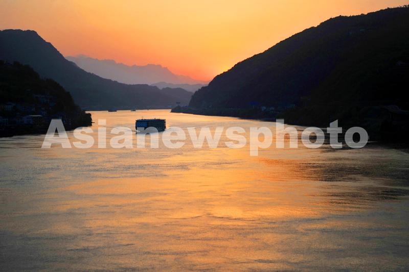 2023年4月16日,在湖北省宜昌市夷陵区乐天溪镇拍摄的晚霞映耀中的长江西陵峡风景。当日,位于湖北省宜昌市夷陵区乐天溪段的长江西陵峡水域,金色霞光映洒满江面,生态峡江呈现如画风景。