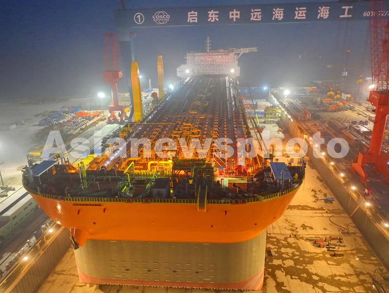 2023年4月17日夜间,在江苏启东中远海运海工船坞中,世界最大吨位级新型海上浮式生产储卸油船挑灯夜战建造忙。