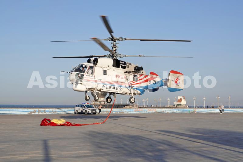 图片说明:2023年4月16日,装载灭火吊桶的卡-32直升机从山东烟台一处临时起降点起飞。